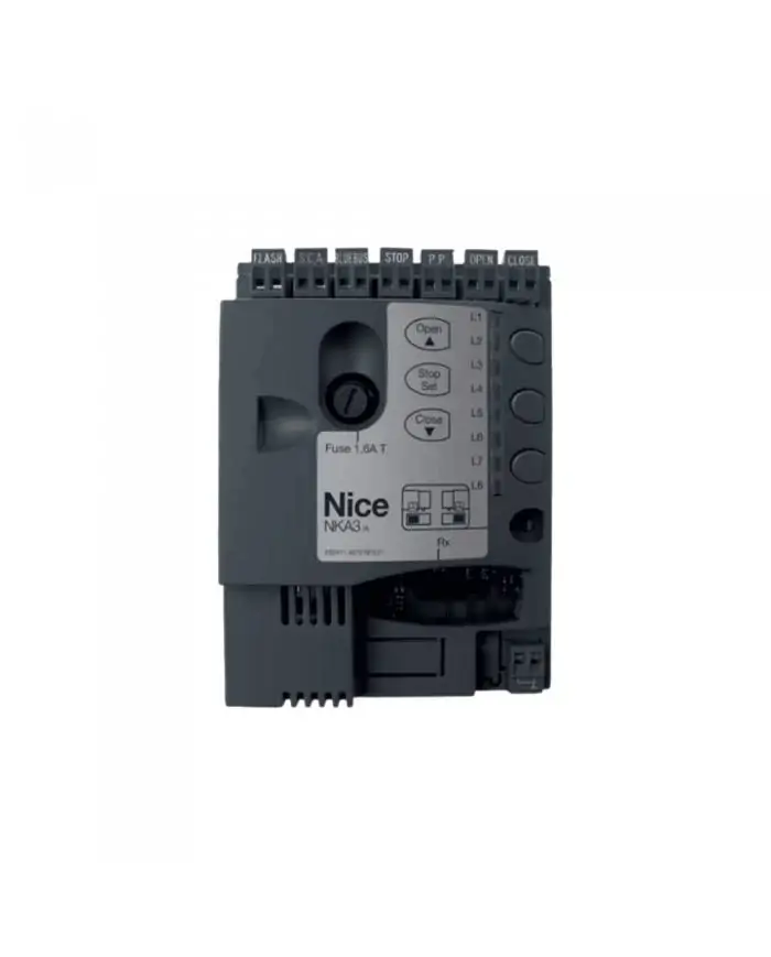 Nice NKA3 control unit, original spare part for Slight 400 gate motor. 230V AC, IP44, 433.92 MHz. Italian-made, in stock with 2-year warranty.