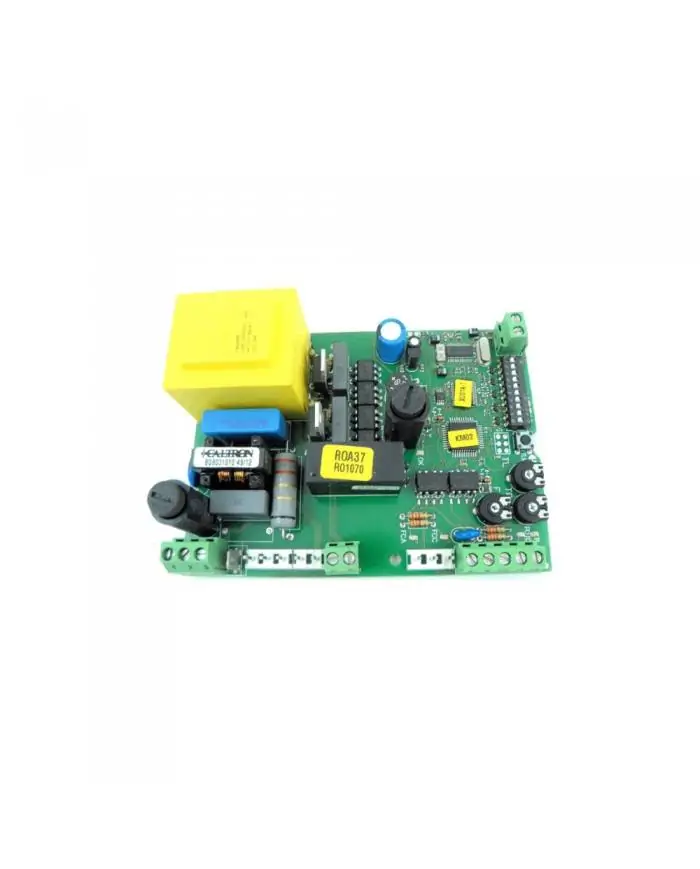 Nice ROA37 is the original main control board used in Nice brand sliding gate motors. The board manages the entire operating cycle of the gate motor — opening, closing, speed ramping, direction detection and emergency stop — through a single central unit. Operating on a 230V AC mains supply, the board outputs a 24V DC motor signal and automatically protects the system against overcurrent and short-circuit conditions via integrated circuit protection. An integrated radio frequency receiver is built into the board, eliminating the need for an external receiver module, thereby reducing installation time and additional cost. Parameters such as opening-closing time, automatic closing wait delay and motor torque can be precisely adjusted via programmable DIP switch blocks. The board is designed to be positioned inside a motor enclosure with an IP44 protection rating and is configured to be protected against external factors such as moisture, dust and vibration.