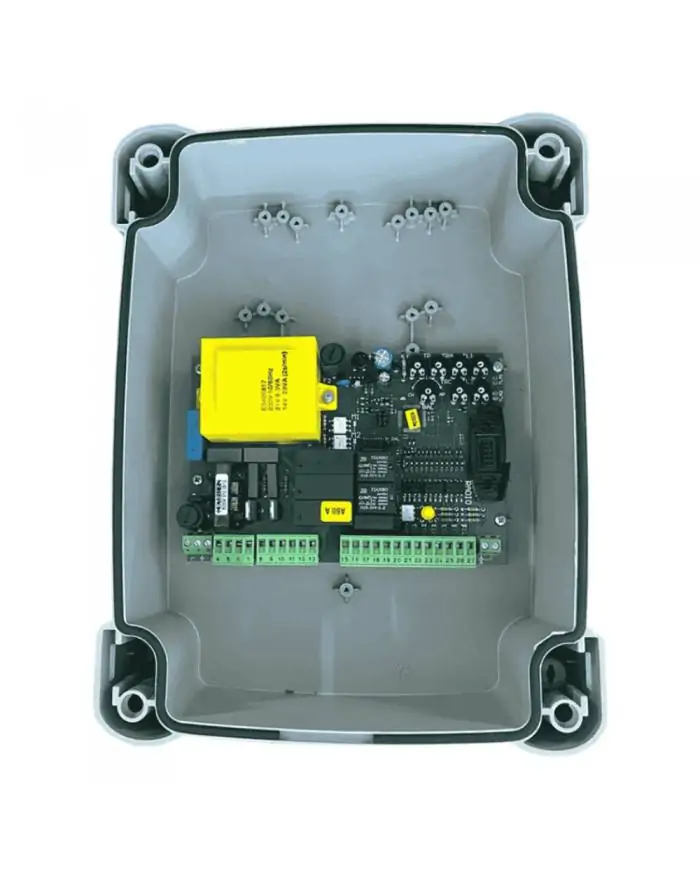 Replacing this control board is of INTERMEDIATE difficulty. Access to the automation enclosure is required to remove the old board, and the existing wiring connections must be photographed and documented beforehand. The power, motor, photocell, and control lines connected to the terminal blocks on the board must be transferred to the new board in the correct order and with the correct polarity. Additionally, software parameters (such as deceleration distance and automatic closing time) may need to be reprogrammed via the buttons; this can be done by following the user manual step by step. The procedure can be carried out comfortably by an experienced end user with basic electrical knowledge or by qualified service personnel; however, users without electrical knowledge are advised to seek authorised service support.
